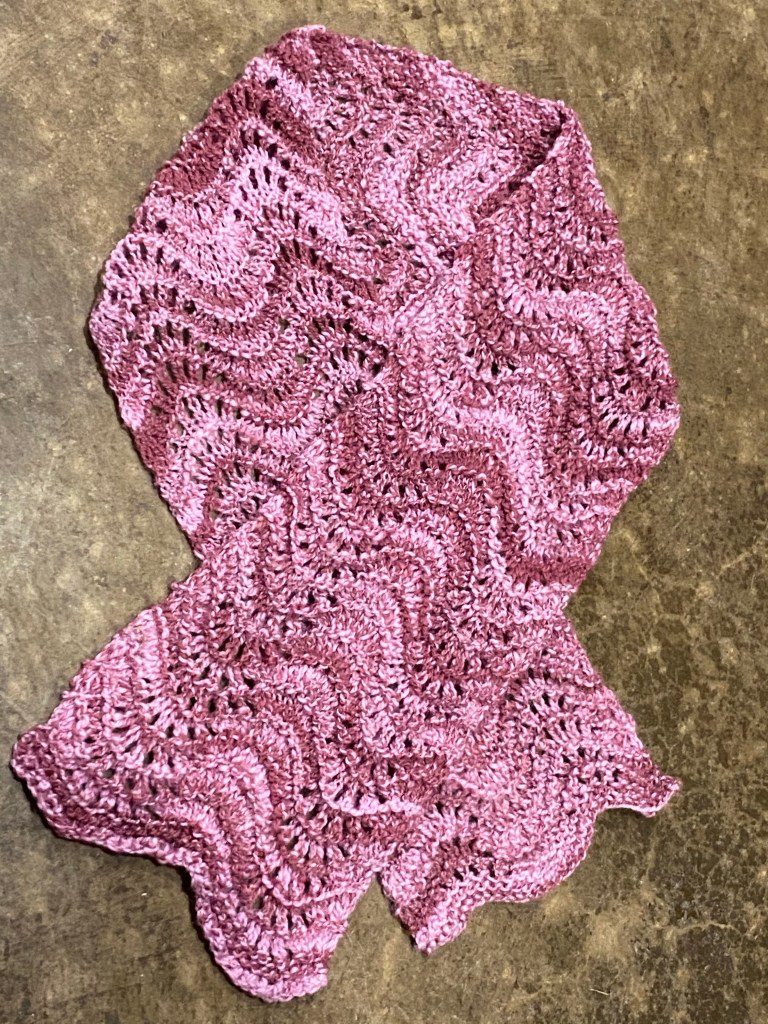 The lace scarf is done! It isn’t very long, but I used up all my fiber, with only a short segment remaining.
