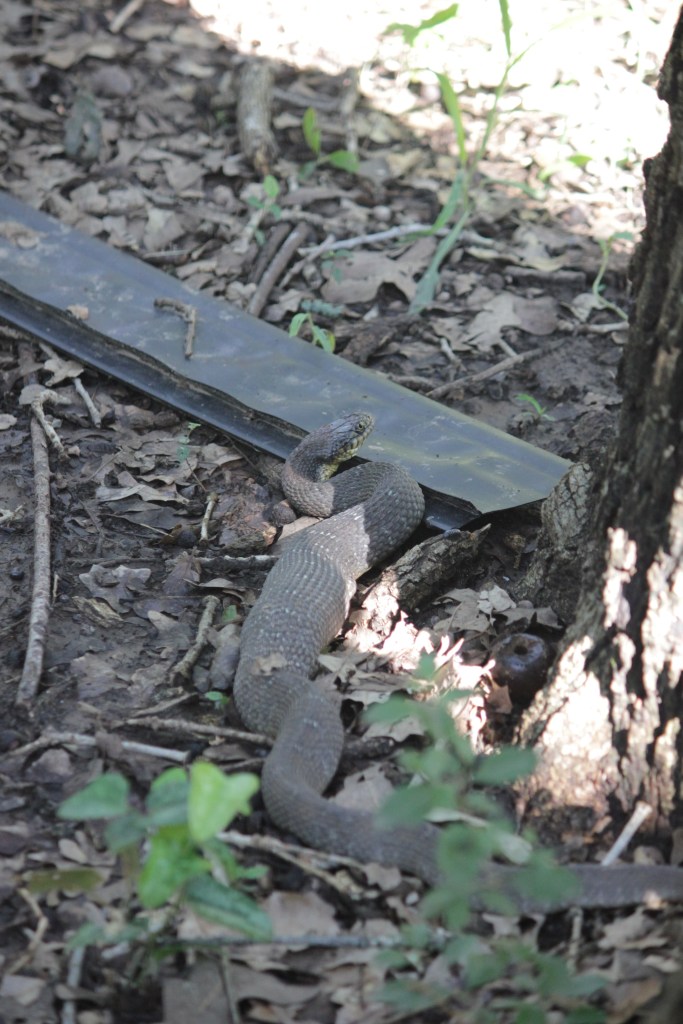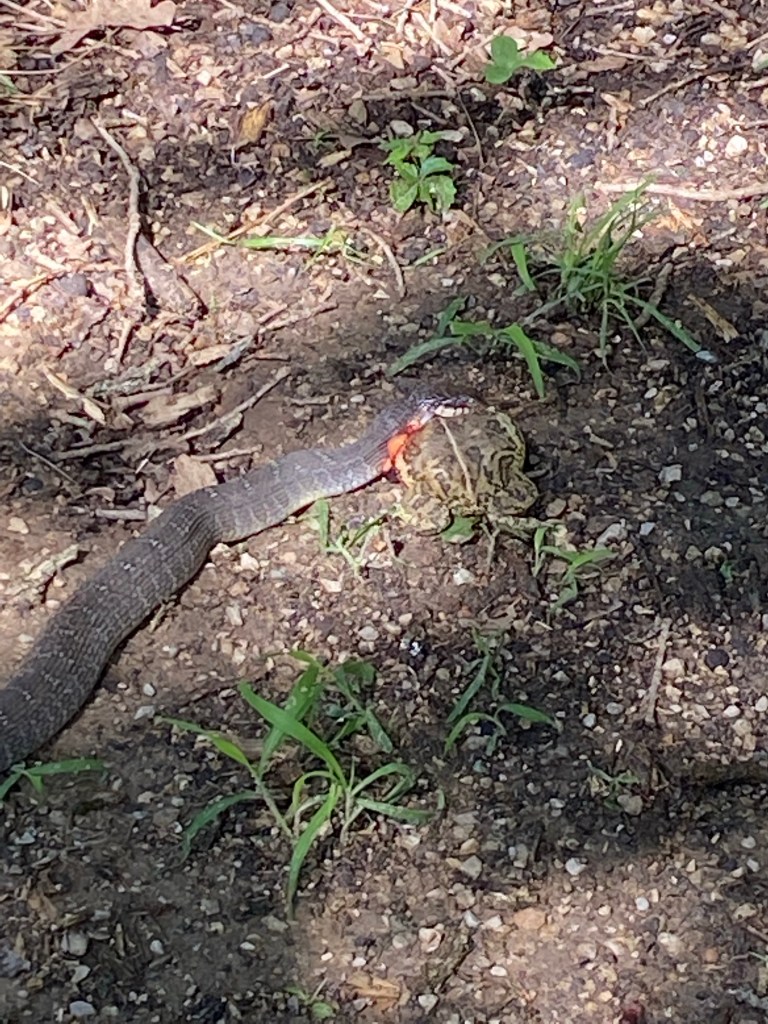 (I figured I would spell it out in the title so those disinclined toward serpents could skip this post.) My eagle-eyed eldest spotted something in the backyard and informed me that there was a snake out there eating something. I grabbed the snake grabber and went to investigate, but it was just a plain bellied water snake eating a toad, no venomous beastie (I did get the ID from the experts on “What Snake is This? North Texas Educational Group on FB). I’m a little sad for the toad, as we seem to be down to one backyard toad and one garage toad, but it was really cool to watch the snake. We kept the dogs inside as the snake lay by our patio table waiting for the toad to deflate so it could finish the process of swallowing it. We would check on it at intervals (and take pictures), and finally the poor pups couldn’t cross their legs anymore so we put them on leashes to go do their business. The snake, full and sluggish, eventually slid out of the yard. It took two hours, but the serpent was eventually able to finish its very large meal!