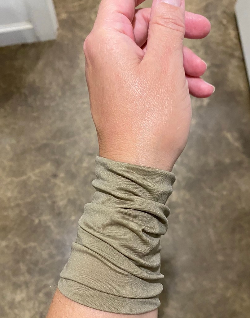 In the heat of the Texas summer, many turn to cooling devices worn around the neck. I’ve tried, really, and after 5 minutes I simply can’t take it. I’d rather be hot than have the pressure on my carotid (or maybe it is the jugular, but nothing can brush the back of my neck either, so there we go.) So I took a “cooling” neck gaiter, cut it down, and resewed bits to fit my wrists. Wetting them down certainly produces a cooling effect, and having them arranged in wrinkles rather than folded increases the evaporation. We’ll see how they do for me this summer. If they do work, I need to make some in nicer colors!