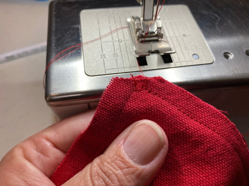 7. Sew handles right sides together, then turn right-side out. Press. Sew over seams, close to edges.