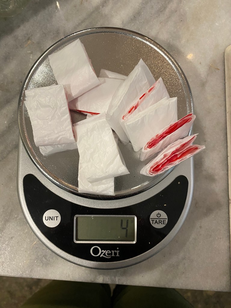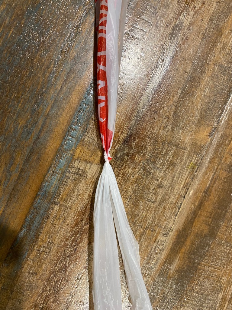 A crafting friend recently reminded me of the value of plarn. Plarn is yarn made from plastic (PLastic-yARN). Typically it is used in recycling efforts by giving new life to used shopping bags. (And oh the things people make, just image searching plarn is its own rabbit hole.) The attraction of cutting up bags is that if you cut them from side to side you end up with loops, which are very easy to connect into longer pieces. So I set my grocery bags out to dry, then cut them into loops by folding them length-wise several times, squeezing out the air, and cutting about one inch sections. (I found the measurement of the end digit of my tallest finger is one inch. Convenient.)