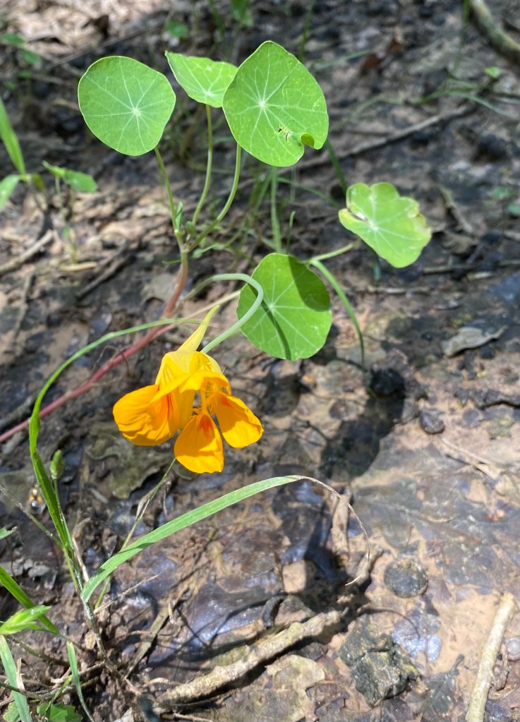 More unexpected flowers. Nasturtiums seeds that I planted two years ago past the back fence have sprouted and bloomed. Not much light filters through the forest canopy, and I had given up hope on flowers in that area. They are leggy, but definitely blooming.