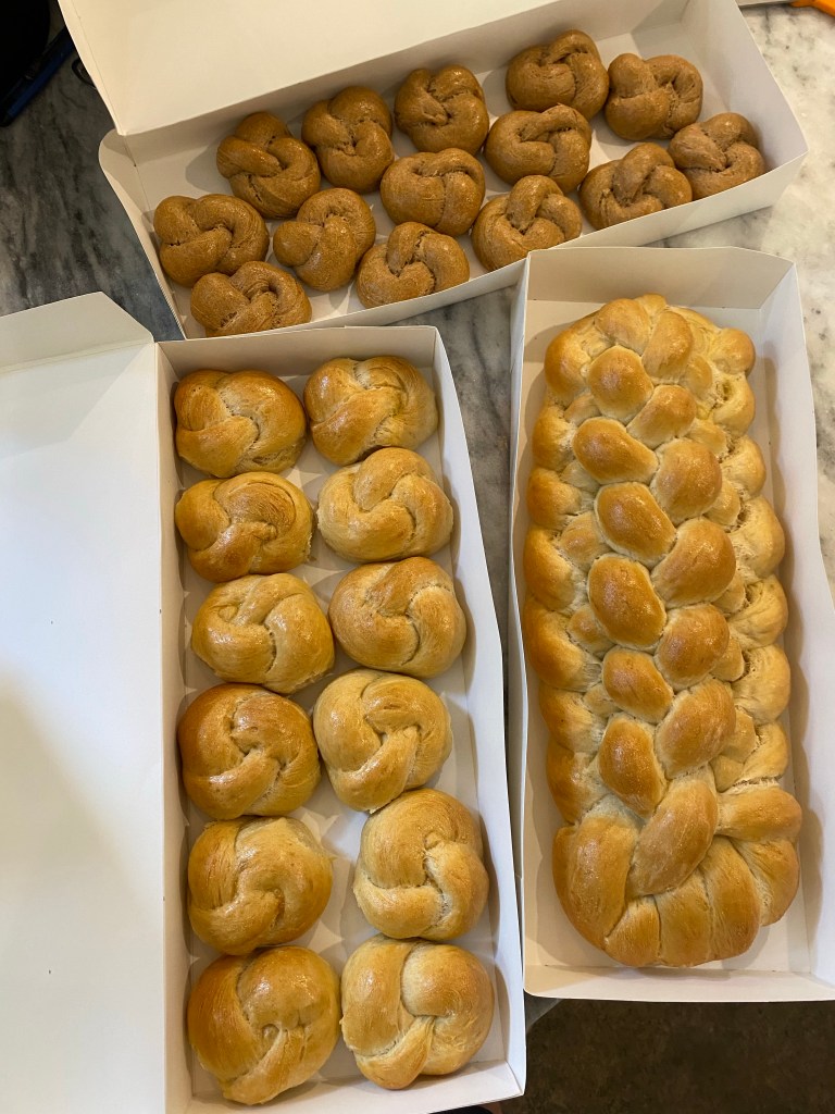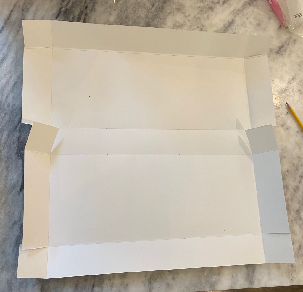 I declared a baking day for myself and then got a little carried away. Instead of making two batches as I planned, I made three. Instead of two braided loaves, which I’ve practiced, I made a loaf and two batches of rolls. It isn’t often that I bake for many people, and I was just so excited. Then it came to how to transport the bread. Hm. I read that cloth lets too much water out and the bread gets dry. Plastic and foil keeps the moisture in, but the crust goes soft. I also didn’t want the bread to get squashed in transport. So I made some boxes out of poster board. I made measurements and drew lines in pencil, cut flaps, and glued the corners with hot glue (which helps structurally as well).