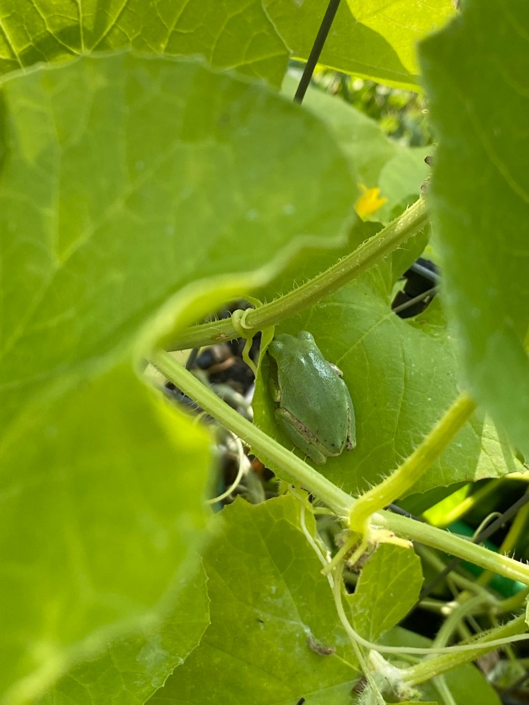 I was looking around my melon vines for more potential melons, and spotted a little green tree frog snuggled into a leaf. He is a very welcome garden inhabitant! Go get those bugs, buddy.