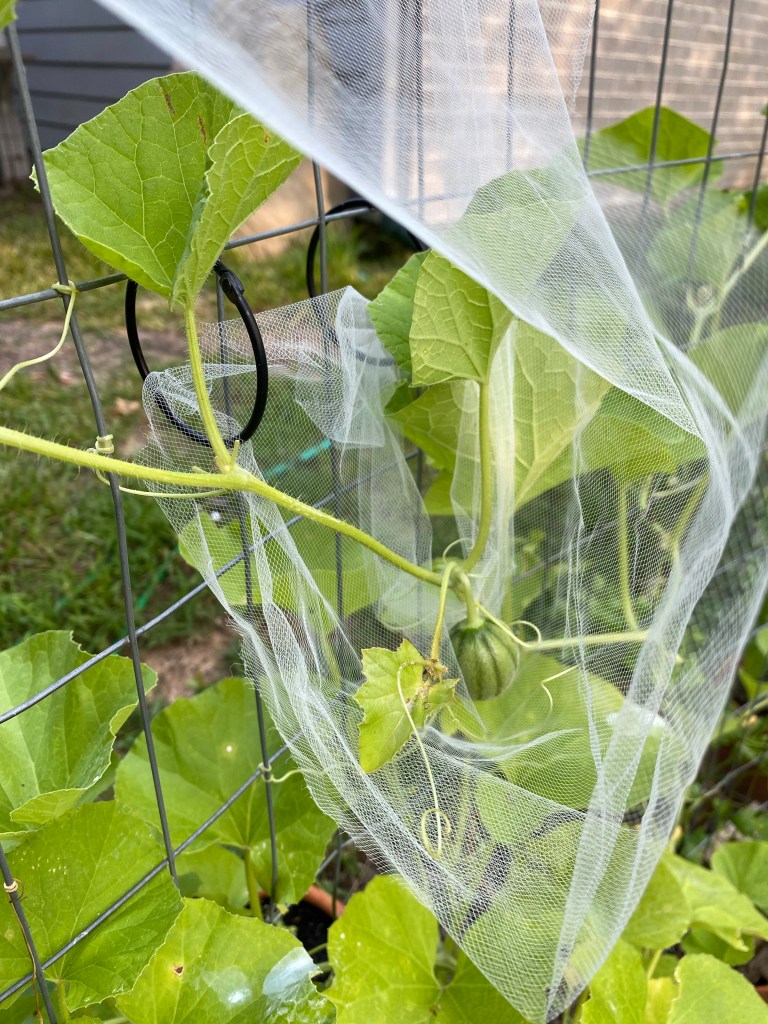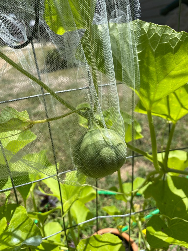 The melon vines that I have been training up the fence have budded fruit! How exciting! But now, as the fruit swells, how to support the vine so the globes can ripen? I tore off some netting from last year’s Halloween decorations and made a sling around the fruit and the vine. I used round clips to secure the corners, both because they can be adjusted as the melon grows, and because they were already hanging on the fence from my makeshift green house. I am also pruning down to one melon per vine, to give the remaining ones their best chance.