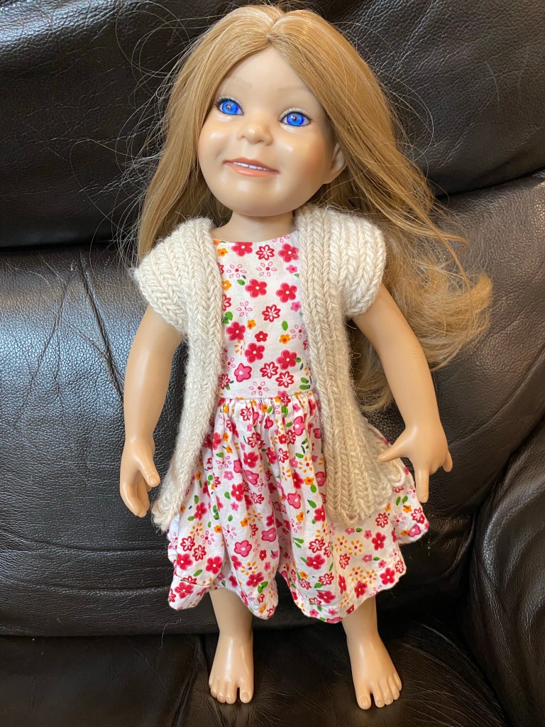 As I was contemplating what to make with the mini balls of test alpaca that I spun, my youngest announced that her other doll needed a new jacket. Ok, that can be done. I chose to nålbind (because I like it best) and used a Finish 2 + 2 stitch with an F2 connection. Because the three skeins were different colors, I decided to put the darkest in the center. I also tried a different construction technique, working in vertical rounds, rather than horizontal. Making the neck and front slit was just a matter of chaining along, rather than connecting, as long as I needed.