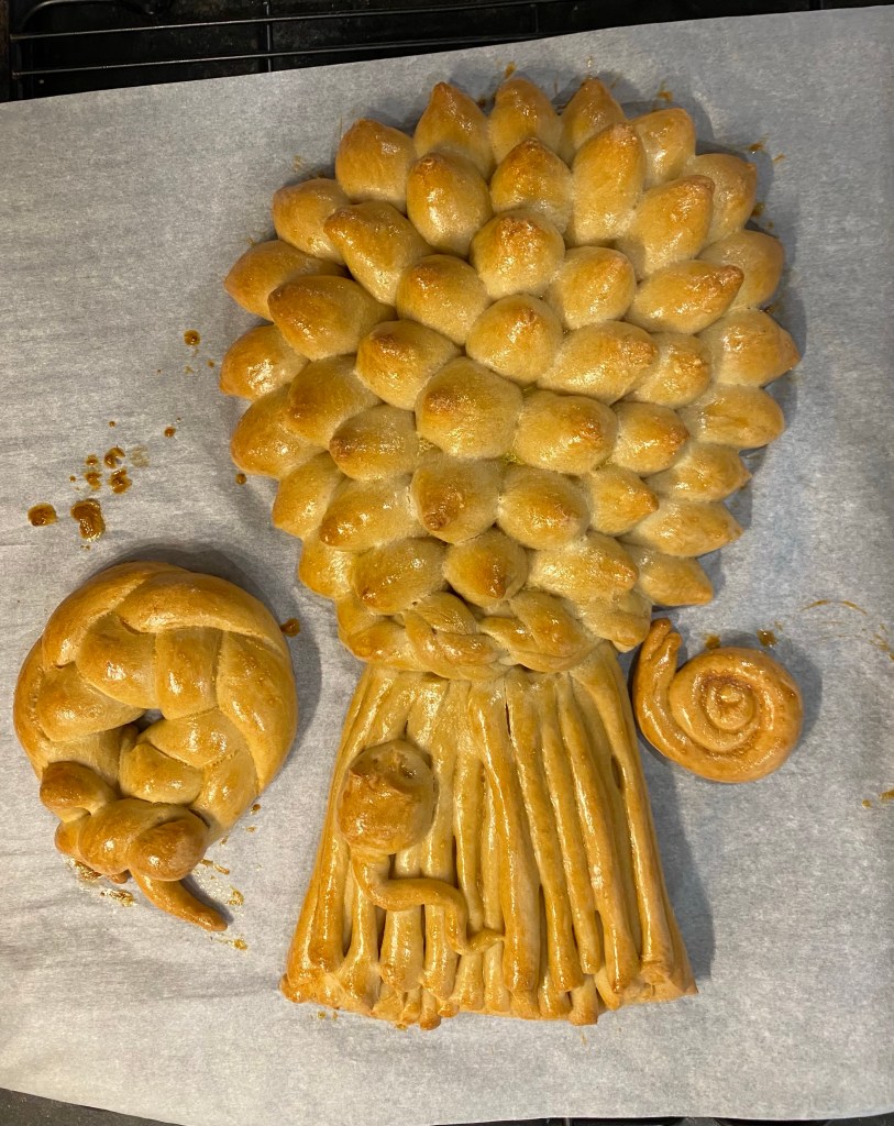 Well, I made a wheat-sheaf loaf. In Paul Hollywood’s book “100 Great Breads”, he says that if you can make a wheat-sheaf, you can make any of the loaves in the book. I’m not sure mine counts as a success. It looks slightly like it is supposed to, (although at a certain angle it looks a bit like a sperm swimming up the tube toward the egg), but wasn’t edible. I’m not sure it is meant to be eaten. Some people varnish theirs. Hm.