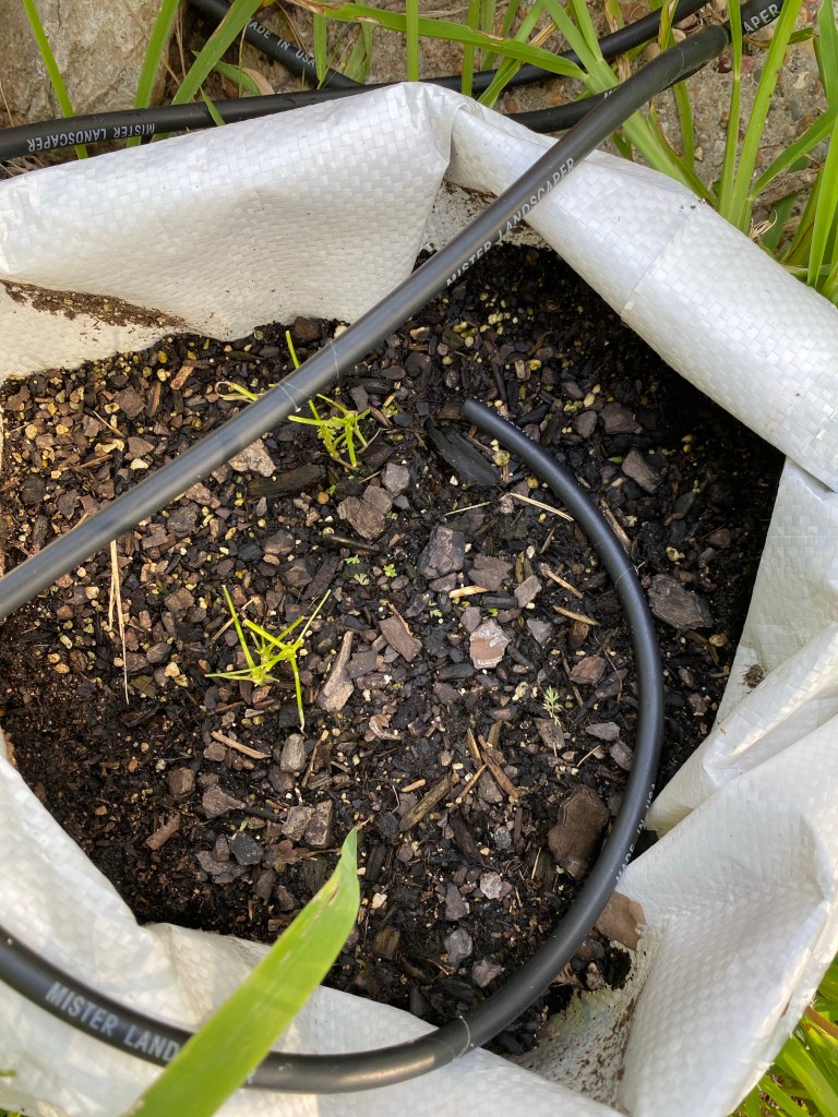 I put some temporary fencing up around my container garden because the tops of my carrots kept disappearing. I suspected rabbits. It was not rabbits. Shortly after the leaves came back, they were gone again, despite the heavy wire guarding them. Maybe grasshoppers are the culprits. I don’t think I will be getting any carrots this year, although they valiantly keep trying to produce leaves. (Yes, I’m growing them in a feed bag, which isn’t very deep, but they are globe carrots, so they don’t need depth. But leaves would be helpful.)