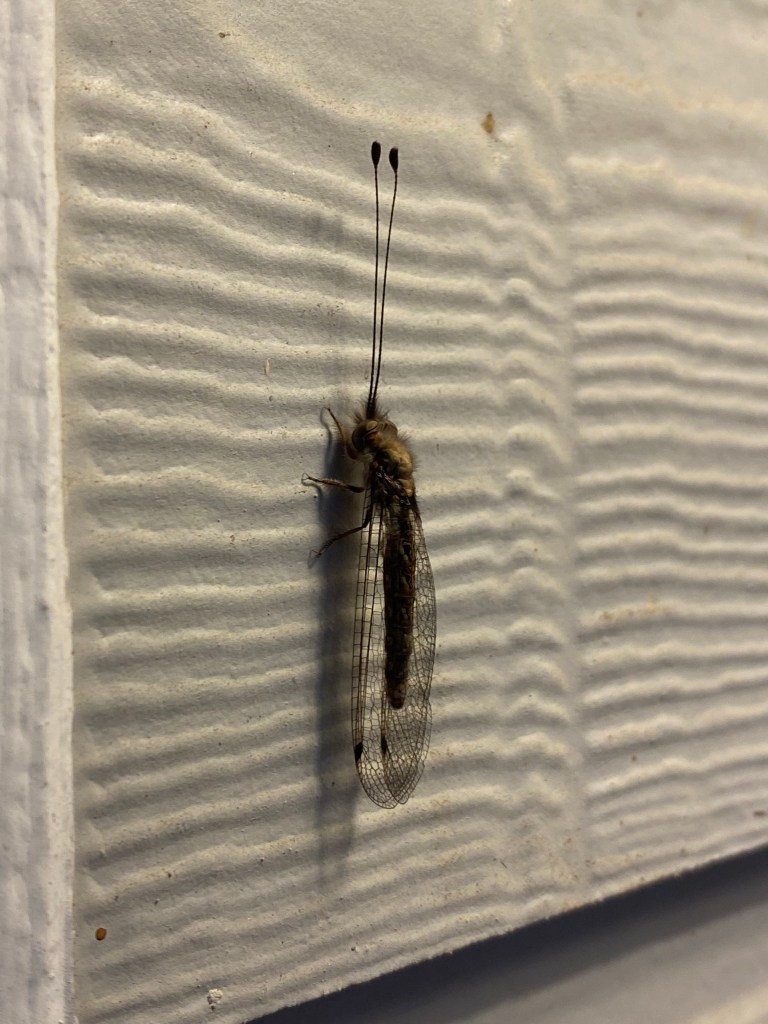 What has the antenna of a butterfly, eyes of a house fly, wings of a dragonfly, and rests like a damselfly? (I guess I gave it away in the title, huh?) I have never seen an owl fly before. This one was resting on the wall of the house under the light when I went out for my morning walk. iNaturalist gave me the ID, and internet research tells me they are predators of flying insects and are often mistaken for dragonflies. Hm. Maybe I have seen one before, then. How easy is it to see those distinctive antenna in flight?