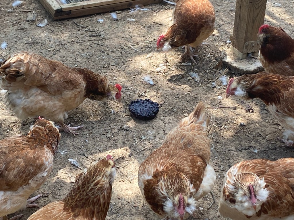 I made blueberry ice cream the other day and was left a pile of cooked blueberry hulls. What to do? The chickens might like them. It is hot out, so freezing them might be good. I put the strained skins in a paper bowl and popped it into the freezer. When I put out the block of frozen blueberry mash for the chickens and they devoured it. I was hoping for purple stained beaks (frozen blueberries stain my hands something awful), but they were quite clean. It does go right through them, though, so for the sake of their fluffy bum and digestive tracts, blueberries will be a sometimes treat.