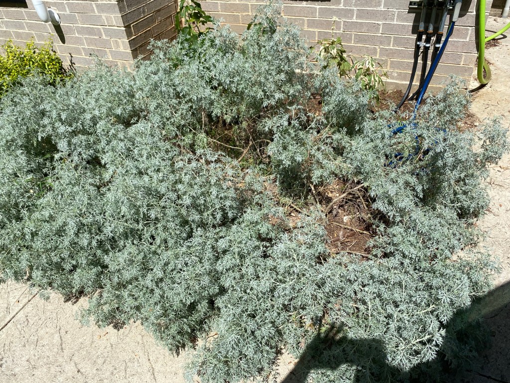 I made the rookie mistake of letting my artemisia get too tall. The tops got too heavy and the limbs laid down on the ground in protest, ruining the pleasant full look. I’ve read that severe pruning will kill the plants, so the plan it to replace the leggy Artemisia with new Artemisia, then keep it trimmed low so it doesn’t get so large as to lay over.
