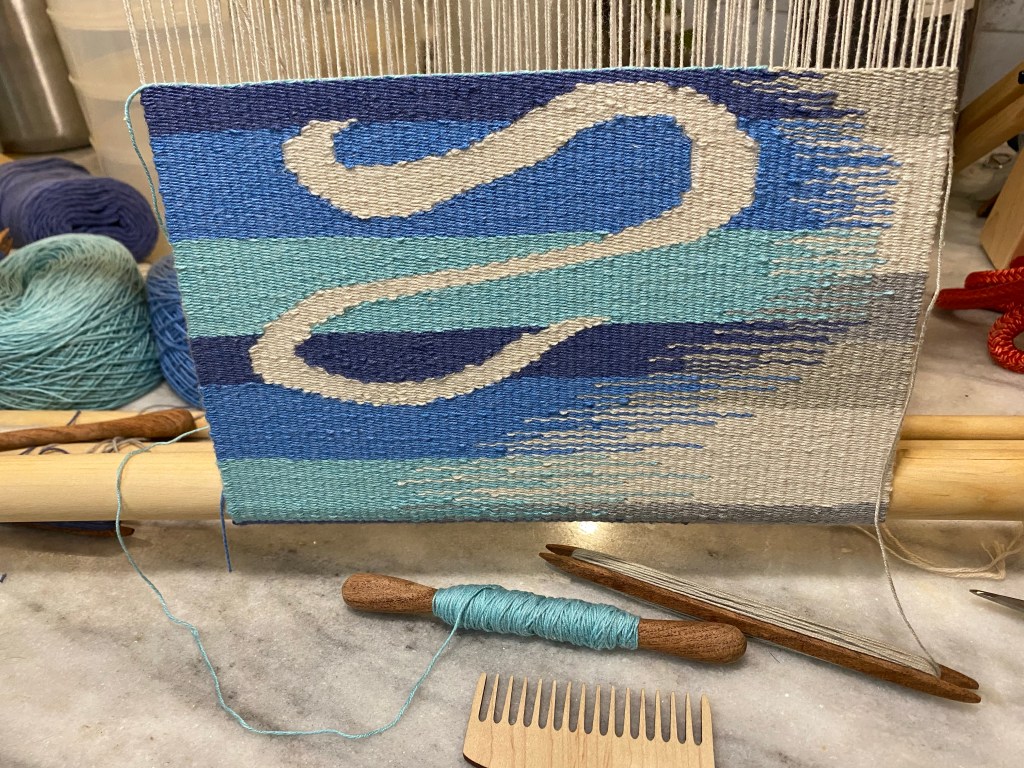 My tapestry loom has been sitting on the kitchen counter, idle, for months, with a partial project strung on the bars. I’m determined to get the project finished so I can reclaim the counter space, but it is slow going. Originally I intended to make a scarf as long as I could on the loom, but in the interests of finishing, ever, I think I shall shorten those aspirations and aim for material for a bag. Current optimism suggests a spindle bag, but even that might prove too much as we cycle into fall and it is much nicer to be outside.