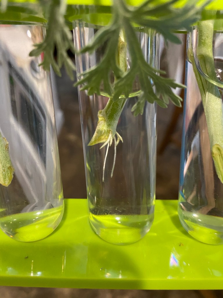 Rather than buy new plants, I’m rooting out some cuttings. I’ve read that other gardeners have had success with this method, and it doesn’t hurt to try! I cut six healthy looking ends and placed them in a test tube rack (because I had it). I was thrilled to see roots starting to form after two weeks! I will keep changing out the water daily, and attempt a replant when the roots have filled in more.