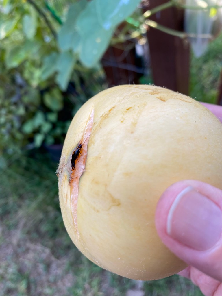 The bugs found the ripe melon. I’m not sure if the earwig dug the hole, or the caterpillars dug it and the earwig was hiding out, but the chickens really enjoyed both the insect and the fruit. I sprayed the remaining melons with diluted Neem oil and Castille soap. Maybe we will get another melon before the bugs do; there are currently two melon candidates for bug roulette.