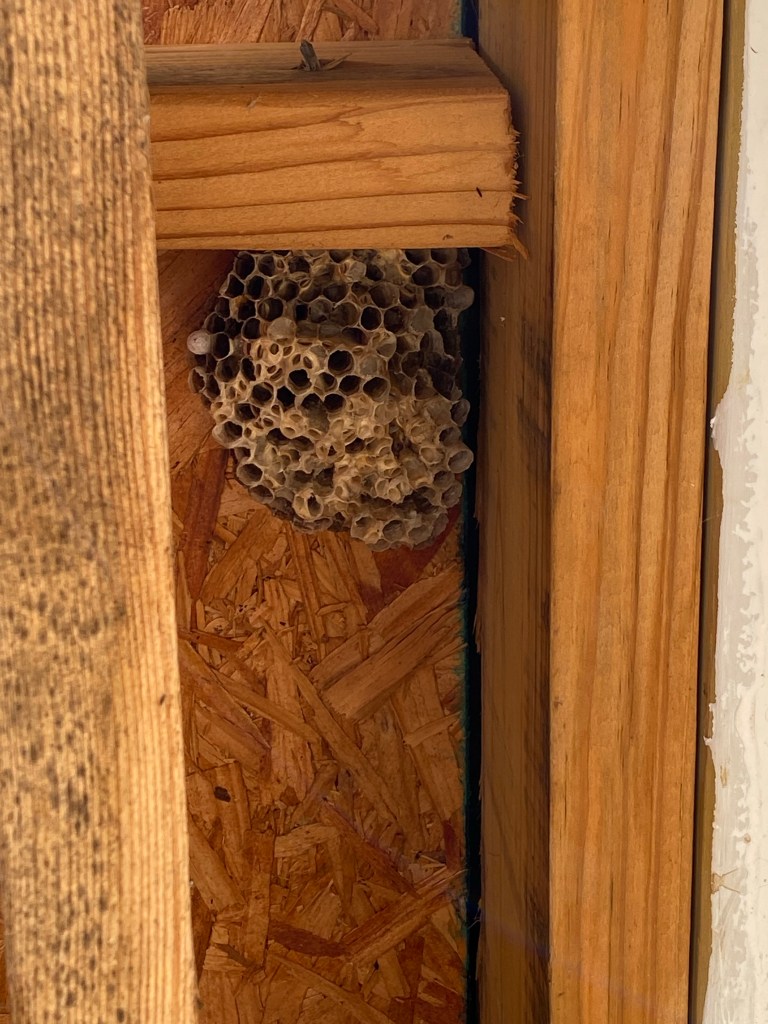 The wasps found a hidden area between the rafters in the overhang in the run to build their nest. I’m not sure how I didn’t disturb them before this, but when I went to fill the far hanging water for the chickens, they certainly let me know they were there now. (There might have been some hollering on my part as I ran.)