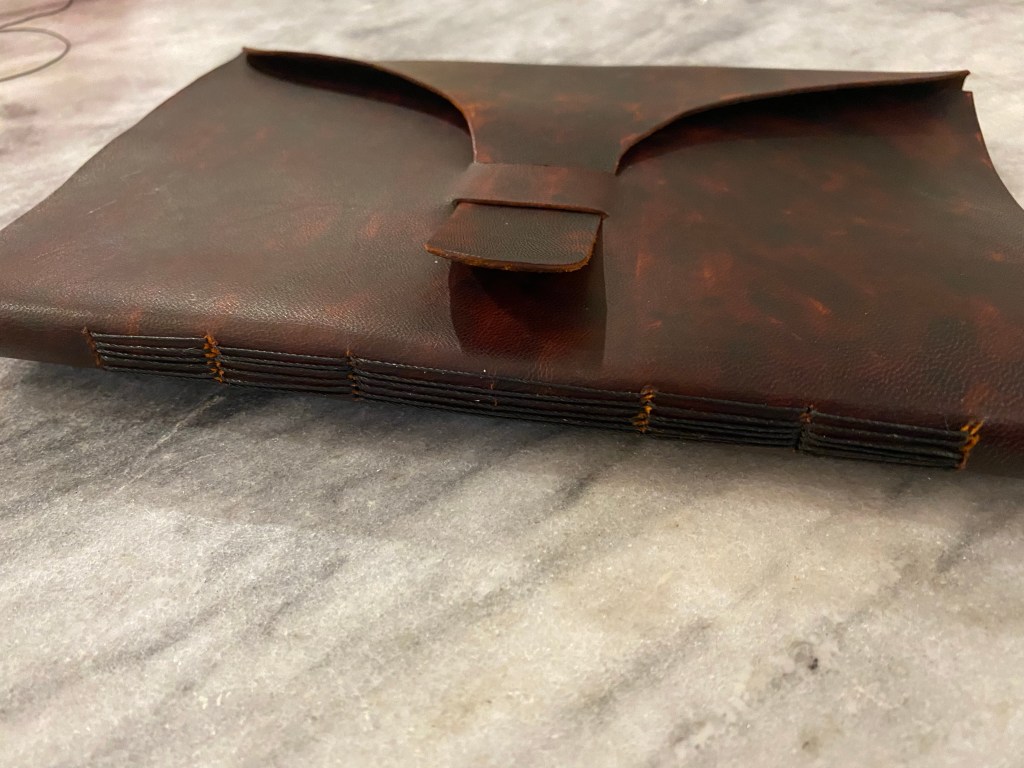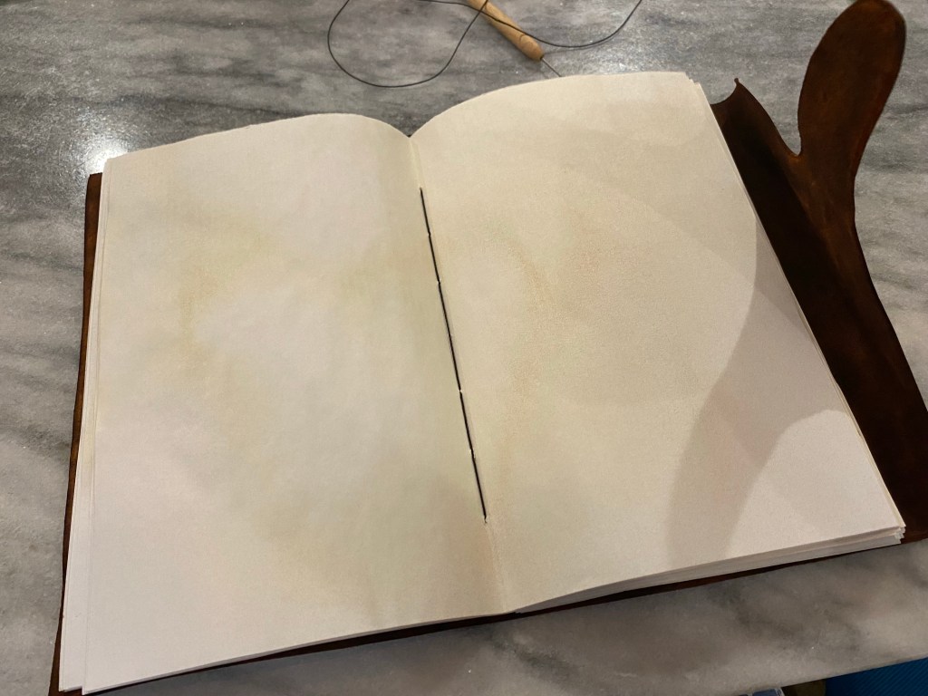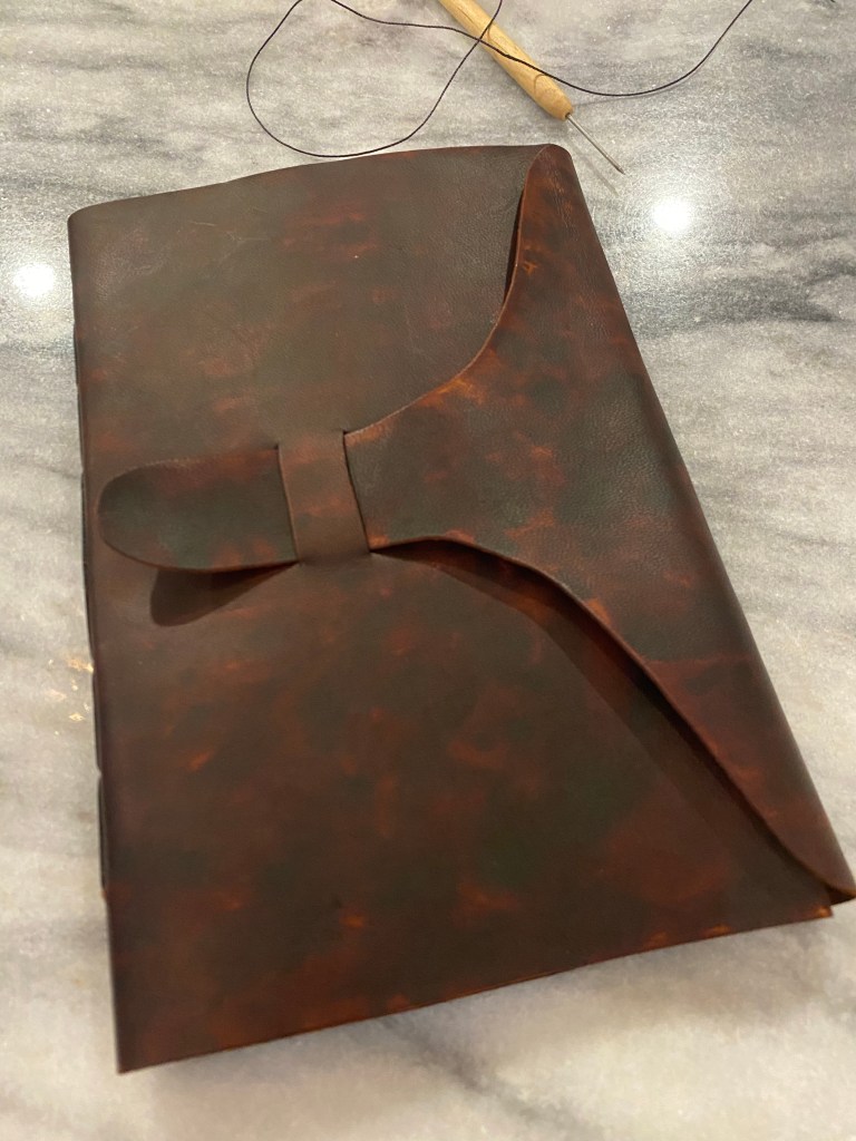 For a prop for a play set in the 1920s, I made a simple leather journal from 11×17 paper, goat leather, and waxed linen cord. I made a paper template to test the wrap and strap, then cut the leather and dyed it in a mottled pattern using a wool dauber. I finished the leather with a spray designed for leather and suede that should resist water and drying out and cracking.