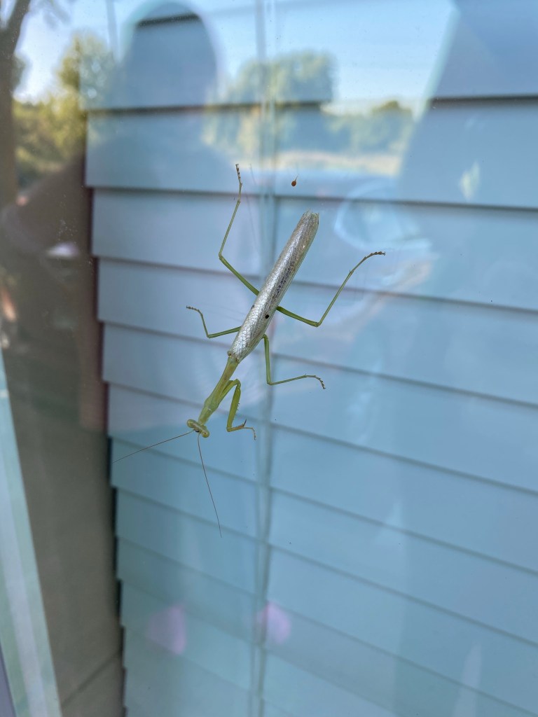 The mantis on the house was missing the lower half of both middle legs, which didn’t stop it from easily scaling the wall.