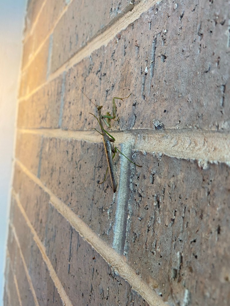 Talking ebbs and flows again. We saw two praying mantises in one day about 17 miles apart. One on the outside of the doctor’s office, and one on the wall on our front porch. We don’t see many of these a year, and two in one day is remarkable.