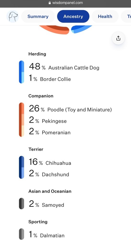 We had Missy the dog’s DNA tested shortly after getting her over a year ago. That test result said cattle dog, miniature poodle, bichon frise, and mutt. Widom Panel updated her results recently and the profile changed. I imagine that as they grow their sample set and the computer algorithms get better, things are going to shift, but I was surprised at the 16% Chihuahua. Hm. Let me adjust that, I was happily surprised there wasn’t significant Chihuahua DNA in the first result, because the rescue said she was a Chihuahua mix. The rescue was right. Looks like dad was cattle dog and mom was a poodle chihuahua mix.