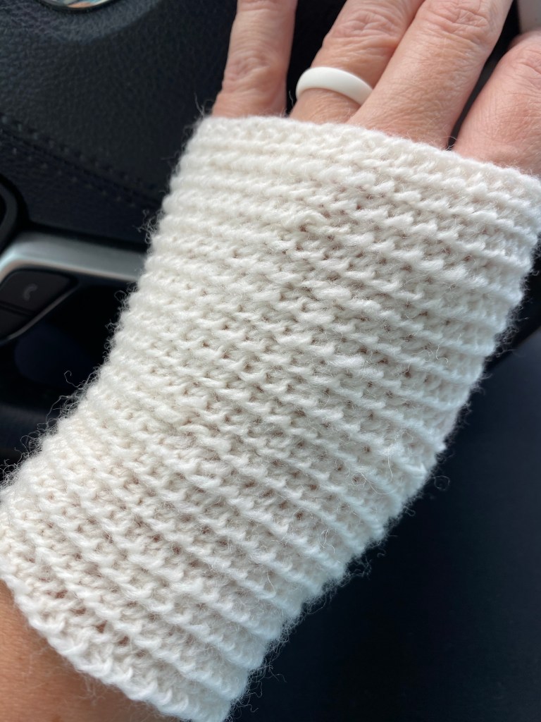 Wrist warmer prototype made with merino wool sock yarn (right side out)Wrist warmer shown inside out
