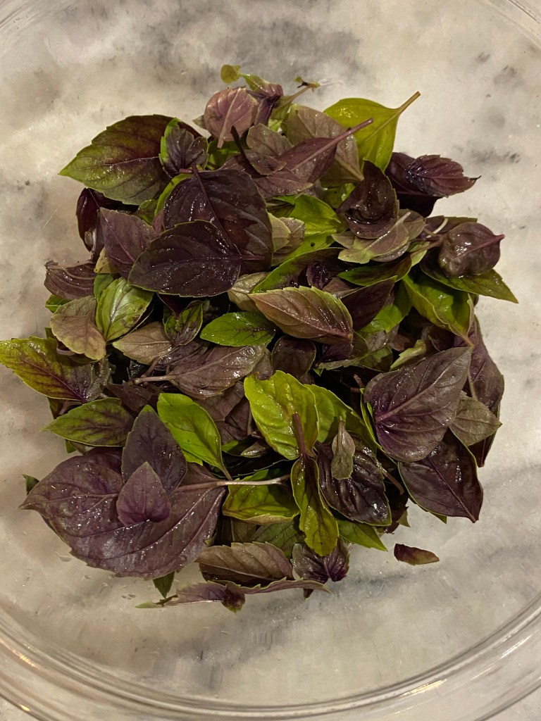 Red basil washed and removed from the stems