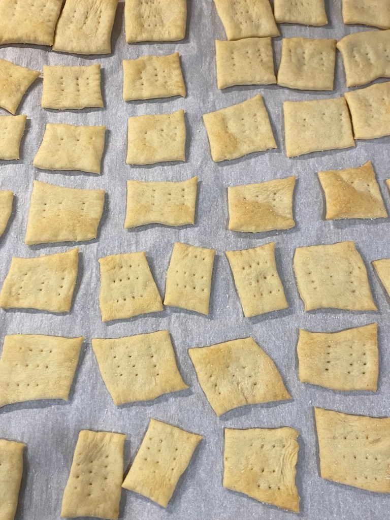 The next thing on my list to make with Heritage Wheat is crackers. Purchased gluten-free crackers are fine, but making GF crackers is daunting. With the gluten available in the Heritage Wheat, the process should be better. I tried one recipe that was quite simple, but called for the dough to be rolled out to 1/8”, which was far, far too thick. Instead I found a recipe from King Arthur Baking that worked very well. The dough doesn’t take long to mix, but then sits in the fridge overnight. Rolling it out thin and cutting it wasn’t hard, just took a little time. I did over bake some at the edges, and some in the middle didn’t crisp, so I stuck those back in the oven with the door open and the oven off. I think next time I make these I will bake them for about 10 minutes, then turn off the oven, crack the door, and let the crackers cool in the oven.