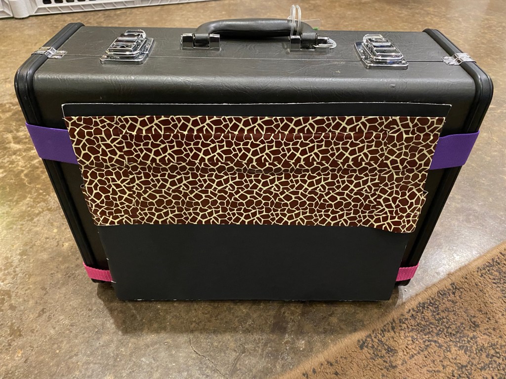 Poster board, duct tape, webbing straps, elastic, thread, and command strips. These are the supplies that went into a new music holder on the side of my youngest’s coronet case. The previous pouch secured with command strips was fine for a music book and a couple loose sheets, but couldn’t hold up to the pressure of a binder. The poor binder hung out in the backpack, lost and forlorn during band practice. To reunite music and instrument, I built a new pouch on the side of the case out of odds and ends from around the house. The bottom of the poster board folder is secured with a strip of pink webbing, looped around the lid, sewn together at the ends, then duct taped inside the folder. The top utilizes wide elastic so it has some give and grip, also sewn together, then duct taped to the outside of the poster board. A couple more pieces of duct tape make guards to keep the binder from sliding sideways, and the command strips now have a minimal job of keeping the whole unit from sagging down the case an inch. The previous command strips removed easily from the case, and they way the new holder is constructed should leave no damage to the case when removed.