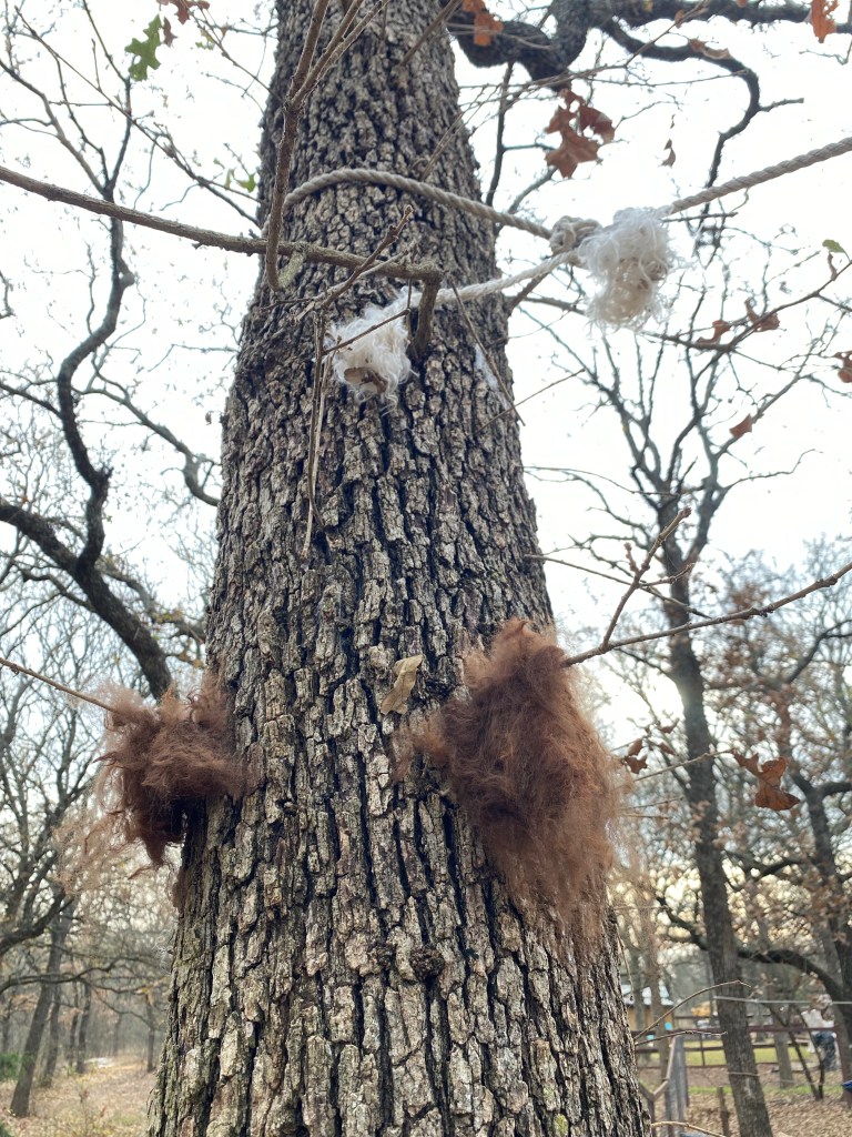 Specifically, there is a squirrel at the end of my rope. She has shredded it and is trying to tug it apart. Here is a fuzzy video. All of the alpaca fleece I left out before is gone, so I put a new batch out. She is going to have some warm and cozy babies.