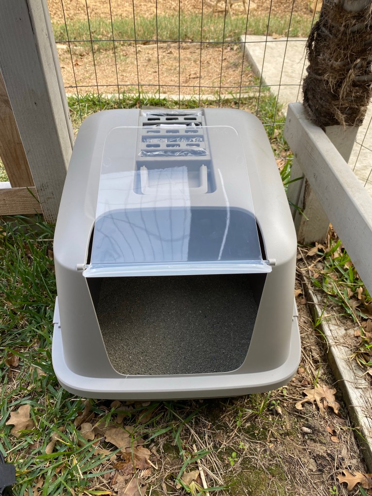 I found extra large covered litter boxes at the store, which I have not seen before in this size, so bought one to put in the catio. It has a plastic top, and the door can be tilted back, which seems like it will keep most of the rain out. The thought of a litter box full of rain is the main reason a box hasn’t been out there before. Apparently my poor Izzy cat has been deprived for years. The inside box was immediately eschewed in favor of the new outside facilities.