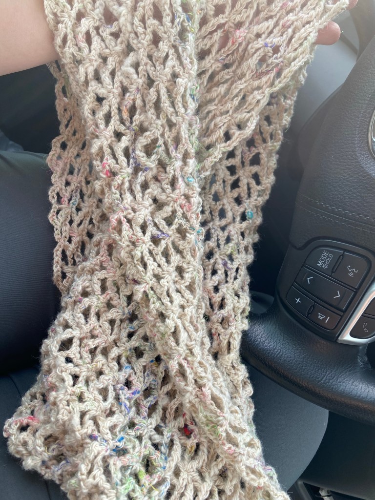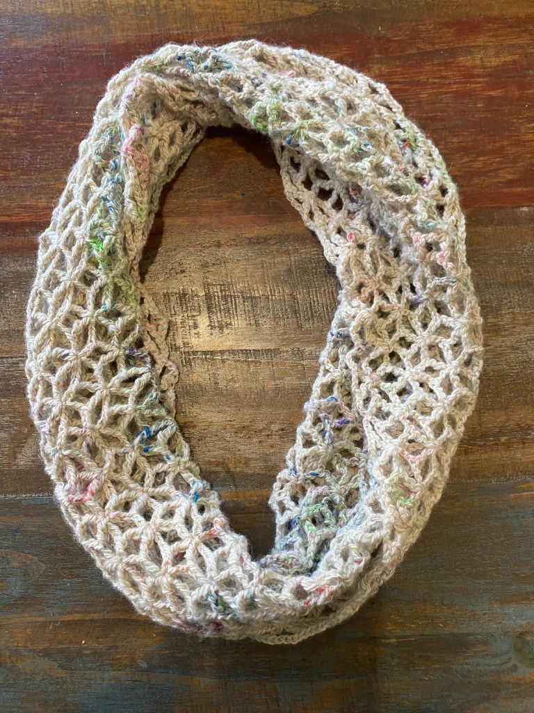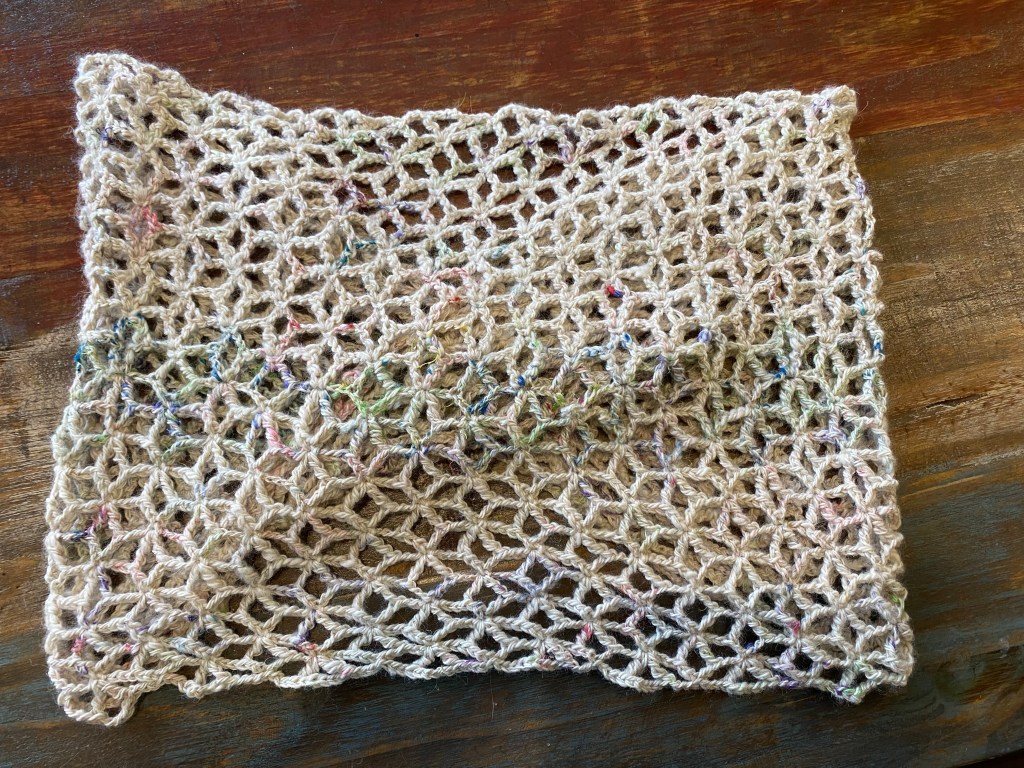 I made an infinity scarf with my hand spun alpaca sari silk yarn and my tessellated Möbius pattern! I meant for it to be able to slip over the shoulders, but as the pattern progressed, it tightened up considerably. If I make another I think I will add about 10-20% to the base row. After I wove in the ends, I wetted it down and laid it out to dry (blocking), which opened up and evened out the lovely hole pattern.