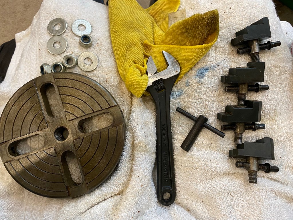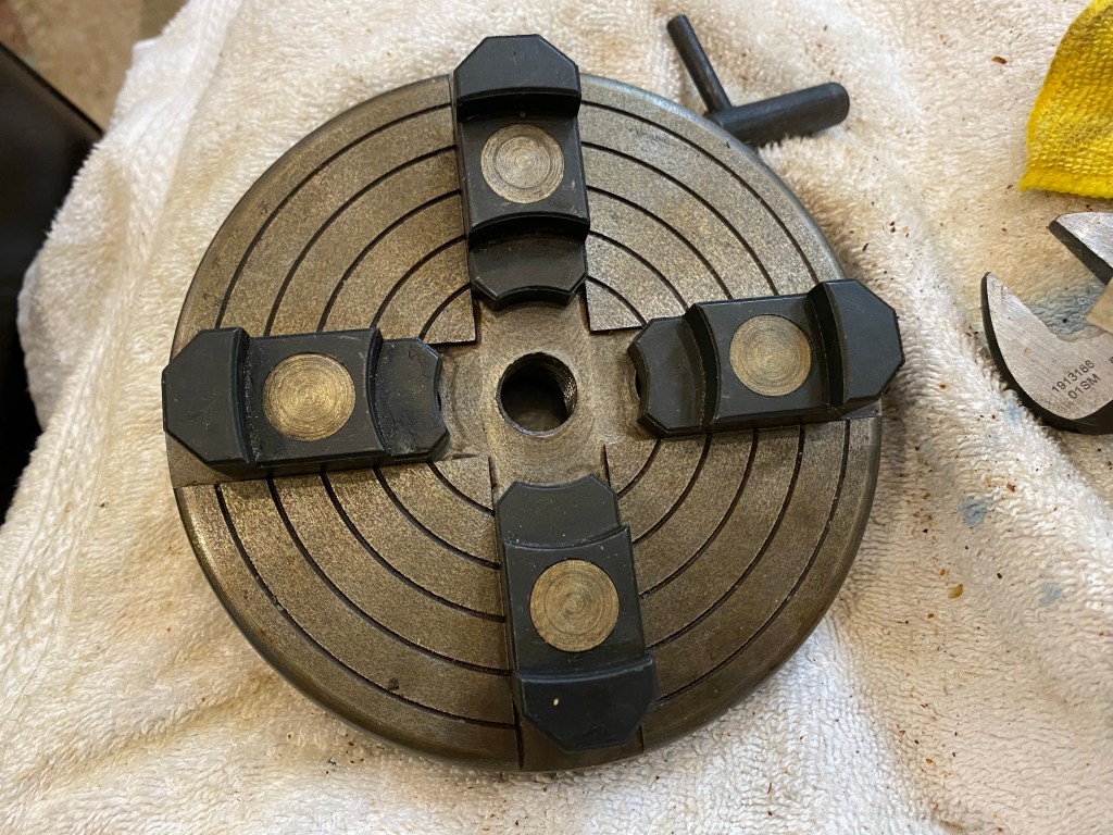 The chuck itself does not have a maker’s mark and the instruction manual is not with my other manuals. So I had to look up some videos on how to use it (and found some really poorly translated instructions). I tried setting it up as pictured, but wasn’t comfortable with the security of the grip, so flipped all the jaws around to hold smaller stock, which does work well.