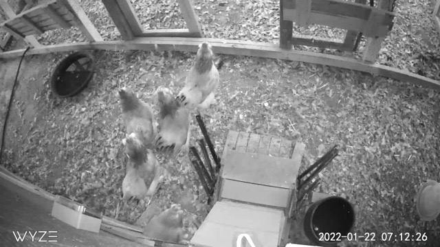 I have discovered that if I close all my apps and check my chicken web cam before I fall asleep or right when I wake up, I’m more likely to have access to the camera and recorded footage, without the dreaded infinite spinning wheel. So maybe my pillow is a conjunction which allows smooth communication between the camera, the network, and my phone. Hm. Or maybe everyone else is asleep and the network isn’t bogged down with traffic. But those are contemplations for another time. Here is a still of the chickens coming out of their coop after 7am because it is cold (but I can tell in the video feed the water isn’t frozen in the run, despite being 25 degrees outside, so that’s nice).