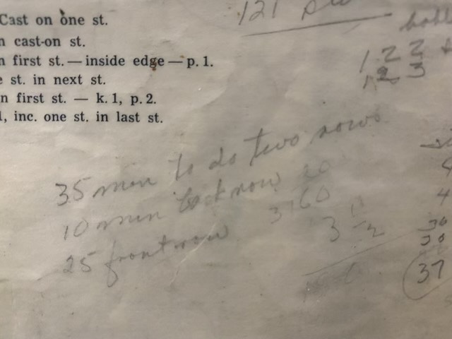 My grandma wrote down on her pattern how long it took her to knit a row on the blanket. She recorded one time for a back row, which is just knit and purl stitches, and a second time for the front row, which takes longer because of the cables.