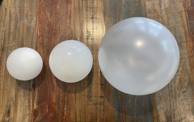 I’ve been baking more bread since I discovered that Heritage Wheat doesn’t bother my digestive system. Recipes cavalierly throw around “rise until double” and I have been bumbling along hoping I wait long enough (but not too long) for the dough to rise to “double”. So what is double? To see, I blew up three balloons, one 5” in diameter, one that was double the first in volume (6.3” in diameter), and one that was double the first in diameter (10” in diameter). Hm. The double in volume seems smaller than my successful proofs, and I have never achieved the size of double in diameter.