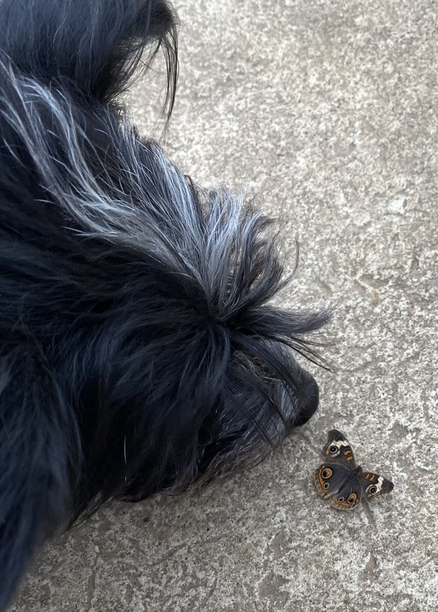 I took this photo before the recent ice storm, then forgot about blogging about it. I was quite surprised to see any kind of butterfly in February even in Texas. I think it was fooled by the 70 degree weather we experienced before we froze, as it was very sluggish. Missy the dog didn’t even see it at first, and keeping her from stepping on it was a trick. She did eventually spot it, and photobombed my shot, so I carefully transferred it outside the fence.
