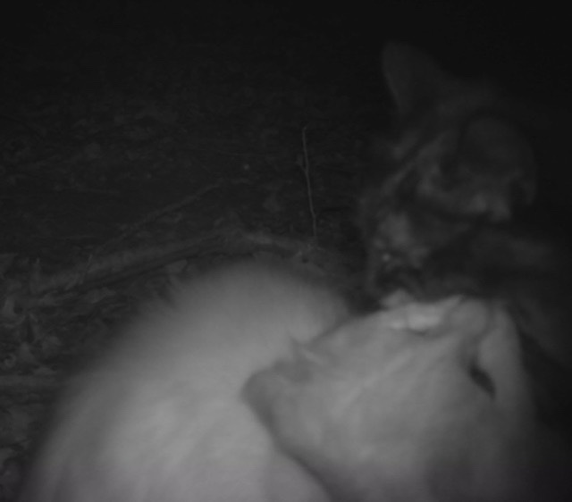 The trail cam caught a photo of what could be a cat fight, but I suspect is more amorous in nature. I’m fairly certain that these are the two cats I kept catching being frisky in the meadow. Hm. I’m working with our neighbor to start TNR (Trap, Neuter, Release) with the local cat population. I’ve borrowed some live traps from one of the the local TNR groups, and I’ll start taking in cats two at a time. That is the theory anyway.
