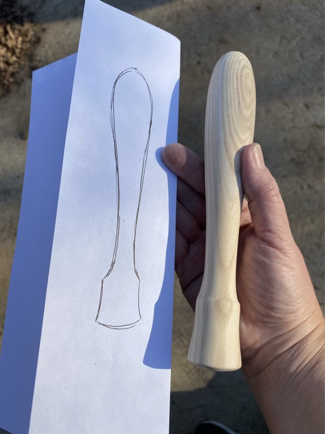 I like both of these definitions of muddle from Oxford Languages, but today we are specifically talking about muddling an ingredient into a drink. To muddle, it helps to have a muddler, which is a hand-held specialized pestle for gently crushing ingredients in a glass. I made this muddler out of a blank of ash wood by turning it on my lathe. First, I did a sketch of my desired profile, then roughed out the blank, refined it, and sanded down from 80 grit to 600. I used the parting tool to separate the muddler from the blank (which is nervous as this is done while the lathe is turning). I did need to sand the ends to remove tool marks.
