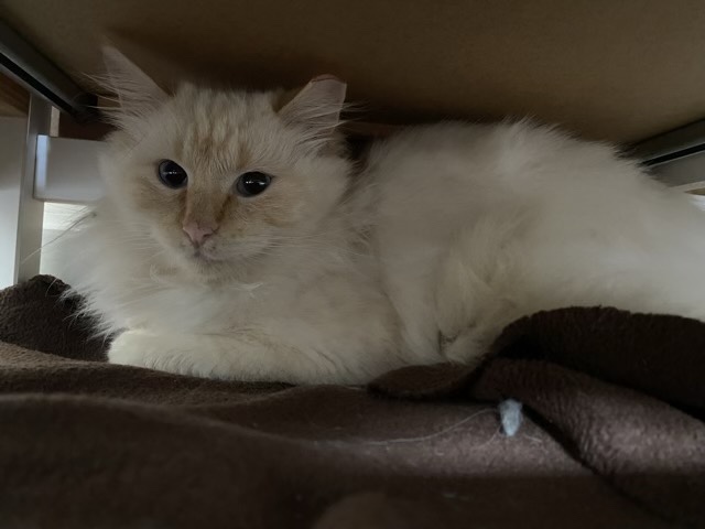 Mr Tom is the friendliest of the colony cats, and my neighbor’s favorite. Because of that, he received special treatment after his neuter, getting set up in our upstairs room for a couple days, rather than being in a trap until the anesthesia wears off. He eats and drinks and uses the litter box, so the prolonged inside time is OK for him. He’ll even let me scratch his chin. The more feral cats, who will not eat or drink while in our care, are better released. He is a beautiful boy too, a long haired flame point siamese with striking blue eyes.