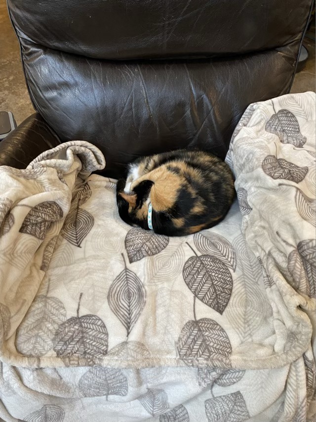 I have been trained well. I put the fuzzy blanket back on my chair (excuse me, the cat’s seat) when I get up so she can get comfortable. The problem comes when I come back. She allows me to pick her up with the blanket and settle her back on my lap, but then unfolding the blanket is awkward and she leaves. I have found a solution.