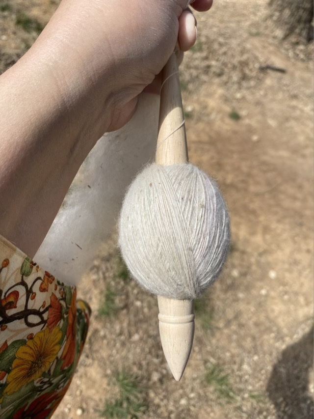 Apparently, I didn’t clean out my fiber bag thoroughly before loading it with cream alpaca fiber. I have shadows of pink and green in the spun singles. Hm. It will be interesting to see if it shows up after plying or in the final piece.