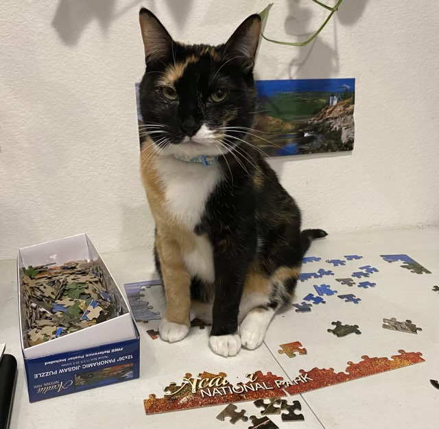 I took the cover off the puzzle, and within two minutes the table sprouted a cat. I feel that she is looking at me thinking “this is my rightful spot, I dare you to move me”.