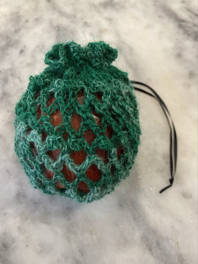 I finished the small bag I started. The initial ball of yarn was spun on a drop spindle using scraps of green colored roving from my Mom’s old stash. After spinning the single, I doubled it to make a 2-ply, fingering weight yarn (about 20 wraps per inch). I started with the opening using a single crochet, made ribbon holes by alternating single crochet and chain stitches, then the body of the bag is made of five chain lace with some picots. It only holds an apple, but its worth is more in the process, which showed me that my handspun, even with rougher wool, does fine as lace. And I still enjoy crochet.