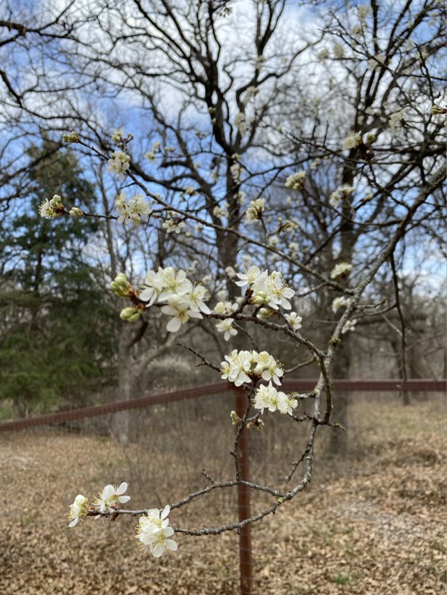 It must be spring. Our wild plum trees are blooming. The first year we moved here there were actually tiny plums in late October, early November. The last few years the summer has been too dry and there has been little to no fruit, certainly not enough to make some wild plum jam. Maybe this summer will have more moisture, maybe. We are currently under wild fire alerts, so hopes are not high.