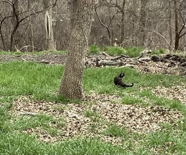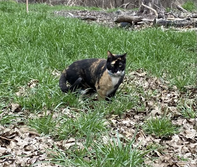 Izzy escaped into the back meadowIzzy, knowing she isn’t a match for what she smells, and letting me come get her from her follyIzzy back safe in the catio