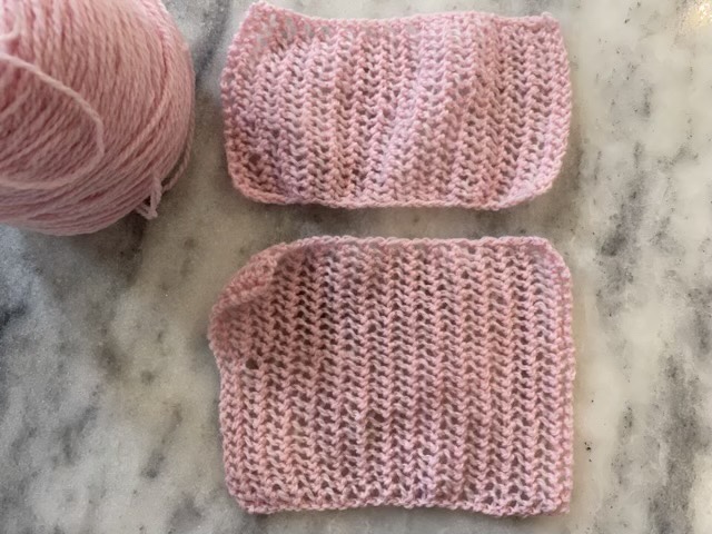 I found a knitting pattern for lace that basically uses two stitches, a yarn over (increase), and a purl two together (decrease). These two alternate and every row is the same. It results in an open weave with dimension and vertical stripes. What? Vertical stripes in knitting? Unusual and intriguing. I made up a couple test swatches with some wool sock yarn with size 4 and size 6 needles. The magic of the lace comes when the pieces are blocked, and the pattern opens up and changes dimension.