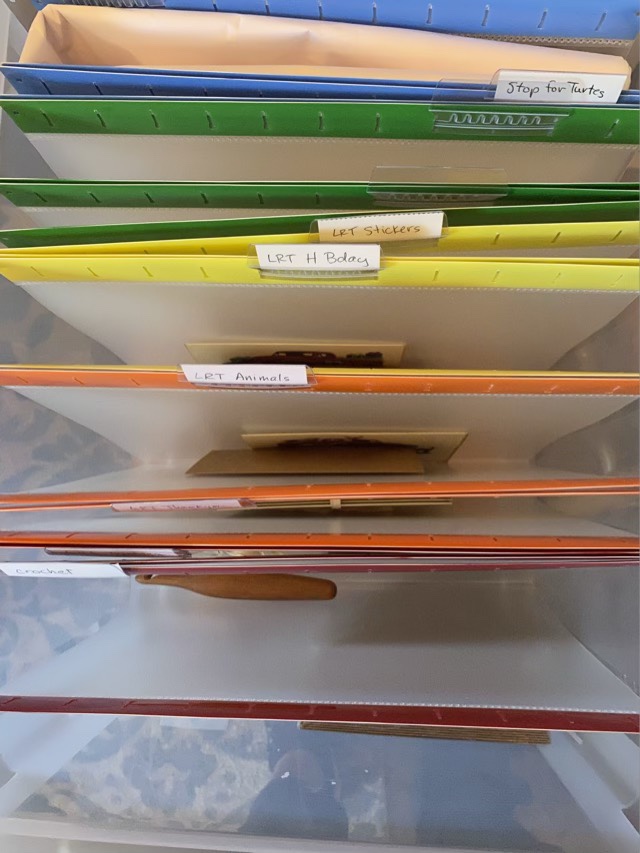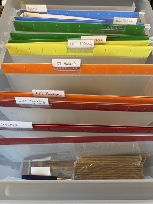 So now that I’m back to posting things for sale on Etsy, I needed a way to organize and protect my inventory. In the past I would tuck boxes into a cupboard, but then have to rummage through the boxes when something sold. This time I bought a file box with hanging folders, and am tucking the cards and wood work into the folders and labeling.