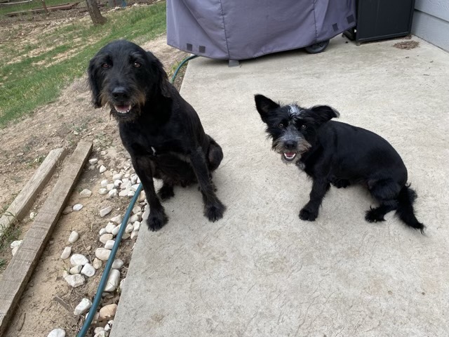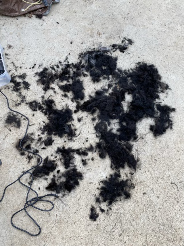 It was time. Time to give the dogs their summer do and shave them down. Griffin is a good boy and comes and sits to get shaved, if a bit forlorn. It takes two of us to shave down Missy, who is less than half Griffin’s size. She is just so wiggly and everything tickles. But it is done, and they are much happier black dogs in this Texas heat. We had enough hair to make a new dog. Literally. I’m quite impressed with my eldest’s fast sculpting; she even arranged the white hairs on the chest.