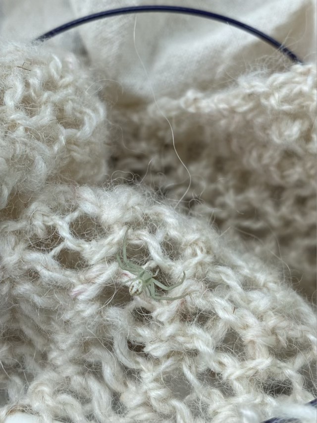 I usually have a project of some sort that hangs out in the car so I can work on it when I’m waiting. I opened the bag and there was a little something extra with my knitting. I have no idea how this little spider found its way into my bag, but I think it goes well with the yarn. I did not keep it (though it is cute), but set it free outside the vehicle. I may need to make a shawl pin or broach with that light green color.