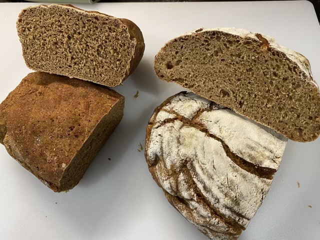 Cut loaves of rye, yeast on right, sourdough on left