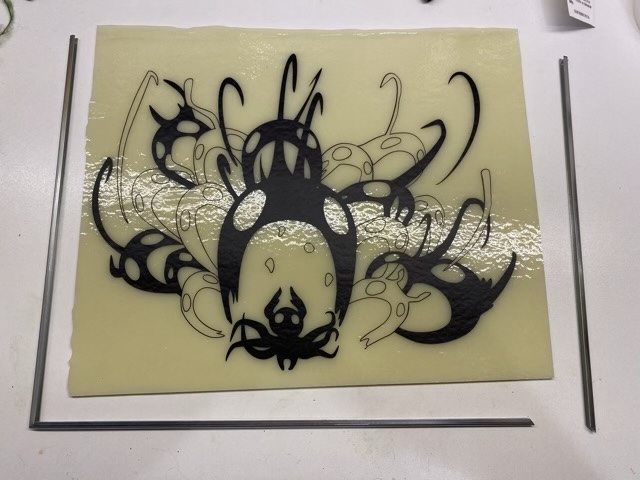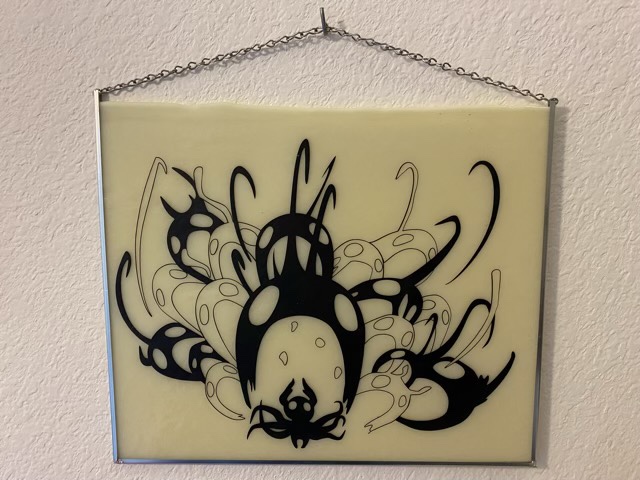 Several months ago my eldest designed a vector graphic of the Abyss Shriek, which is a spell in the game Hollow Knight. (Very very cool graphics in this game; it is a platformer, so I suck at it, but I love the texture and feel of the world.) She used the Cricut to cut out the image in permanent vinyl, then carefully (oh so carefully, so many teeny tiny lines) she weeded out the vinyl. I found a piece of glass in my stash that set off the image nicely and applied the vinyl to the glass. Then it sat. And sat. I had ordered the parts to make a hanging frame for it, the parts had arrived, but it required a bit of soldering. Soldering and I have been historically wary companions. So it sat some more. Finally, when I was avoiding cleaning where the art was sitting, I decided to give the frame a go.